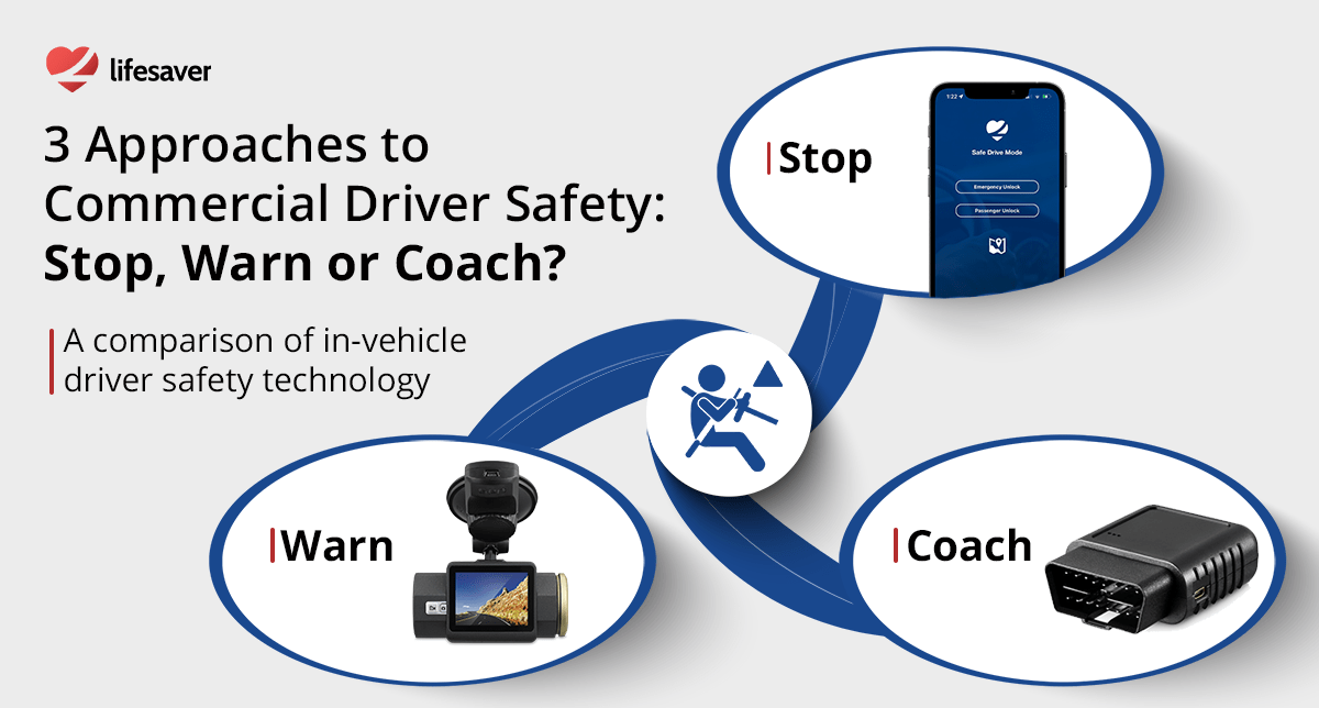 Commercial driver safety technology includes solutions that may block a risky driving behavior, interact real-time with the vehicle on risky conditions, interact near real-time with the driver on risky conditions, or summarize risky driving through back-end reporting.
