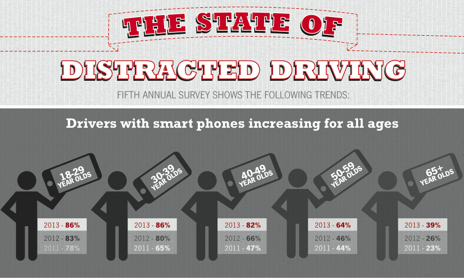 State Farm Insurance Company conducted their 5th annual survey to examine drivers’ attitudes and behaviors related to distracted driving. Below, I split up the info-graphic which details the percentages of drivers who engage in top distracting activities while driving. Note the steady increase of all the statistics over the past few years. It is apparent that these devices we are so addicted to are taking over our lives, and proves that these distracted behaviors are in fact occurring behind the wheel.