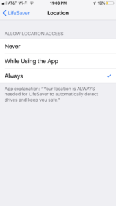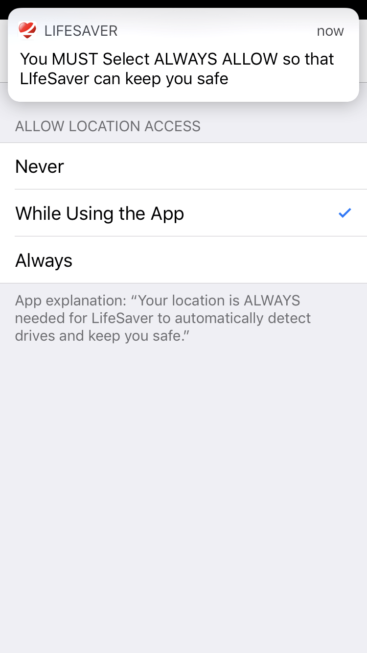 A blue ribbon that says “LifeSaver is Actively Using Your Location” will appear on the top of screen if your “Location” is incorrectly set to “While Using the App”.