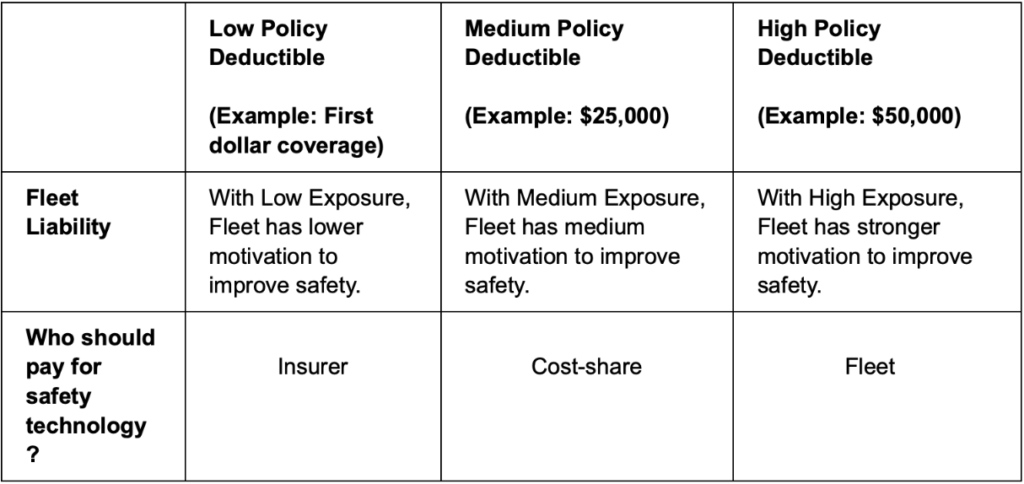In conclusion, the combination of understanding and potentially using fleet insurance deductibles can be a key determinant of who receives the primary value of mitigating driving risk. The higher the exposure fleets or insurers have in a given accident will logically determine that group’s motivation to invest in technology. The organization receiving significant value from the deployment of technology, may make the determination of more aggressively supporting the deployment.